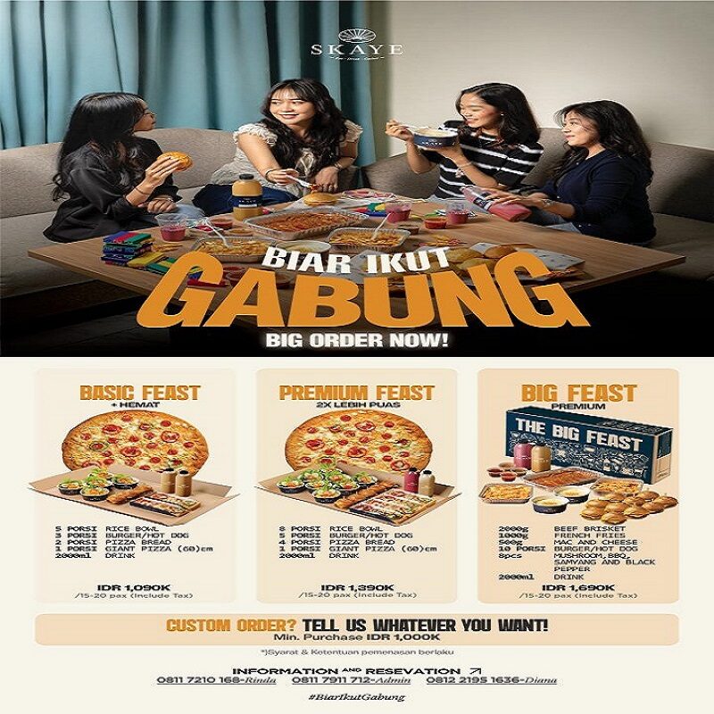 Seluruh paket BIG ORDER Skaye Cafe dikemas lengkap, siap saji, dan hanya tersedia untuk take away atau pemesanan online. Program ini tidak berlaku untuk makan di tempat (dine in).