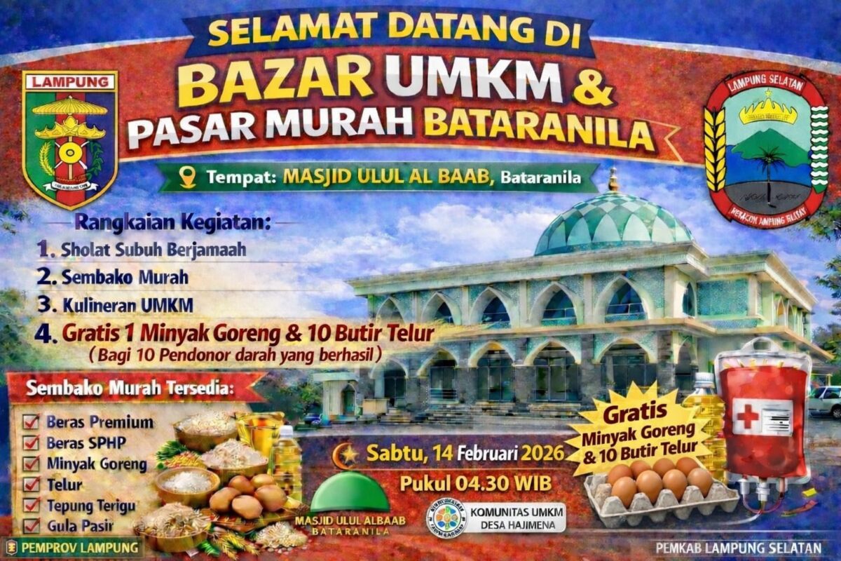 Hajimena (lampost.co) — Menjelang Ramadan 1447 Hijriah, suasana Sambut Ramadan semakin terasa di Masjid Ulul Albaab, Perumahan Bataranila, Desa Hajimena, Lampung Selatan. Masjid tersebut menggelar Bazar UMKM dan Pasar Murah Bataranila, Sabtu (14/2/2026). Selain itu, kegiatan bakti sosial (baksos) tahunan ini menghadirkan pasar sembako murah, bazar kuliner, hingga aksi donor darah. Kegiatan tersebut melibatkan 32 pelaku usaha mikro, kecil, dan menengah (UMKM).
