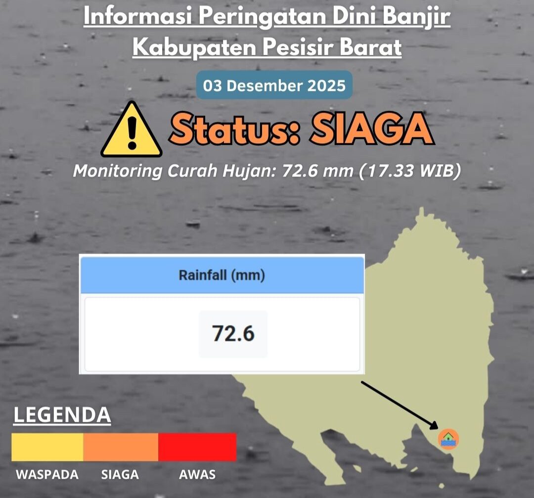 “Peringatan dini banjir Kabupaten Pesisir Barat, Rabu, 03 Desember 2025 dengan status siaga. Monitoring Curah Hujan: 72.6 mm (17.33 WIB). Wilayah terdampak meliputi Kecamatan Pesisir Selatan, Ngambur dan sekitarnya,” himbau Prakirawan BMKG Lampung dalam siarannya.