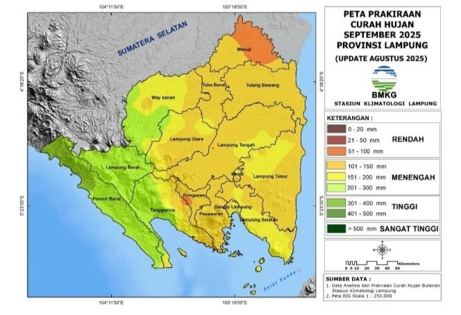 Kemudian untuk prakiraan curah hujan bulan September 2025. Berdasarkan metode statistik dan dinamis dengan mempertimbangkan kondisi dinamika atmosfer dan laut. Maka hasil prakiraan curah hujan bulan September 2025 wilayah Provinsi Lampung berada pada kriteria Rendah hingga Tinggi (51 – 400 mm/bulan).