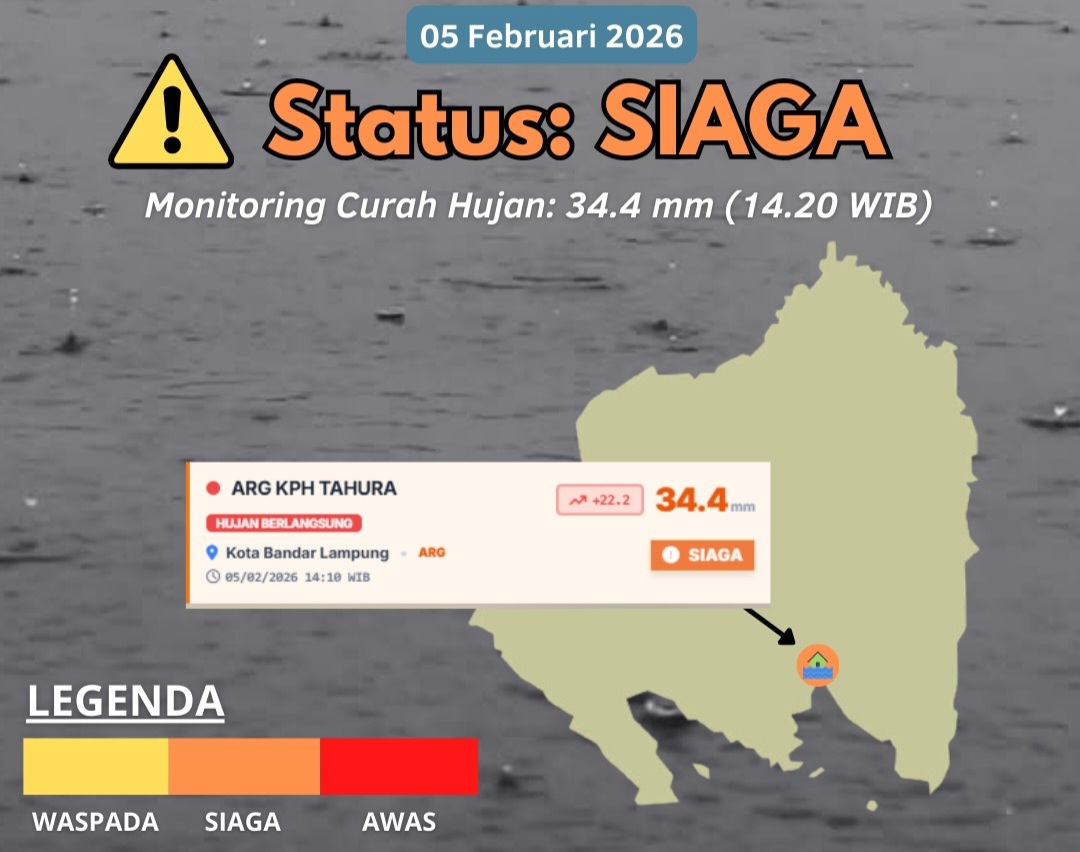 “Peringatan dini dampak hujan sedang – lebat Kota Bandar Lampung, Kamis, 5 Februari 2026 pukul 14:10 WIB dengan status siaga. Monitoring curah hujan: 34.4 mm,” himbau BMKG dalam siarannya.