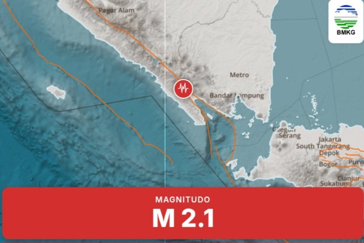 “Gempa 2.1 magnitudo, Sabtu, 07 Februari 2026 pukul 06:16:14 WIB. Lokasi 5.34° LS, 104.37° BT, 38 km Barat Laut Tanggamus – Lampung dengan kedalaman 4 km,” tulis BMKG dalam keterangan resminya.