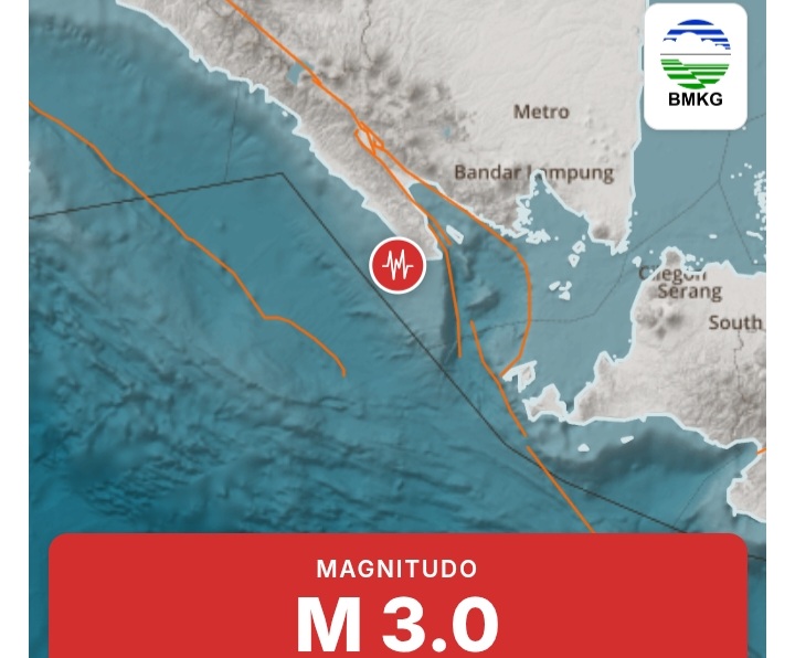 “Gempa 3.0 magnitudo, Kamis, 29 Januari 2026 pukul 12:05:38 WIB. Pusat gempa 5.98° LS, 104.49° BT di laut 59 km Barat Daya Tanggamus – Lampung. Dengan kedalaman 10 km,” tulis BMKG dalam siarannya.