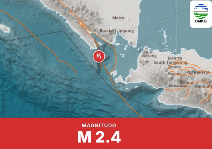 “Gempa 2.4 magnitudo, Minggu, 22 Februari 2026 pukul 06:57:07 WIB. Lokasi episentrum 6.14° LS, 104.79° BT, 74 km Tenggara Tanggamus – Lampung. Dengan kedalaman 48 km,” tulis BMKG dalam siarannya.