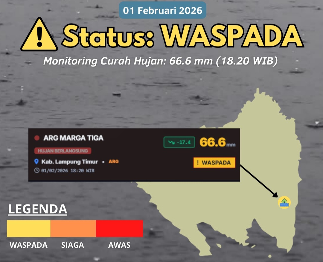 “Peringatan dini dampak hujan sedang-lebat Kabupaten Lampung Timur, Minggu, 1 Februari 2026 dengan status waspada. Monitoring curah hujan: 66.6 mm (18.20 WIB),” tulis BMKG dalam siarannya.