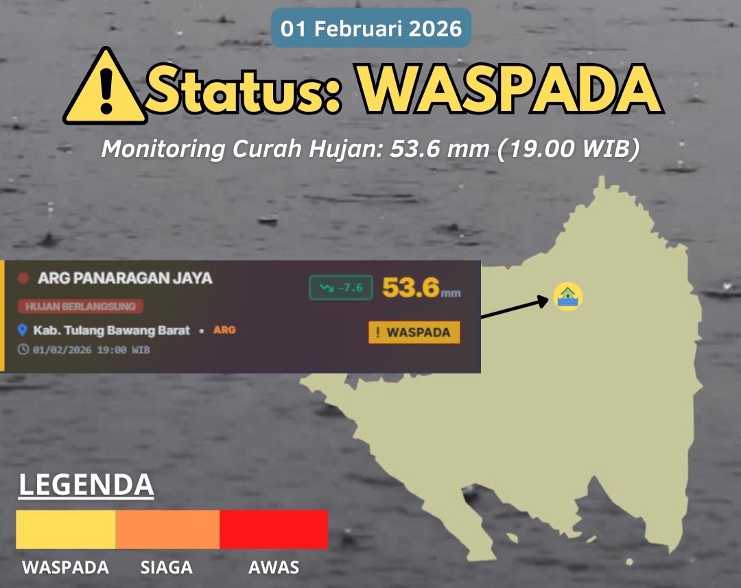 “Peringatan dini dampak hujan sedang – lebat Kabupaten Tulang Bawang Barat, Minggu, 01 Februari 2026 dengan status waspada. Monitoring curah hujan: 53.6 mm (19.00 WIB),” himbau BMKG dalam siarannya.