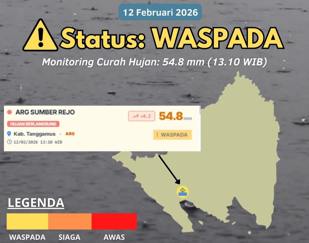 “Peringatan dini dampak hujan sedang – lebat Kabupaten Tanggamus, Kamis, 12 Februari 2026 dengan status waspada. Monitoring curah hujan 54.8 mm (13.10 WIB),” himbau BMKG dalam siarannyan