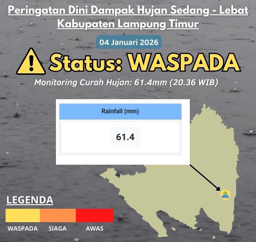 “Peringatan dini dampak hujan sedang – lebat Kabupaten Lampung Timur, Minggu, 4 Januari 2026 pukul 20.36 WIB dengan status waspada. Monitoring curah hujan 61.4 mm. Sementara wilayah kecamatan yang terdampak meliputi Raman Utara, Seputih Raman, Purbolinggo, dan sekitarnya,” himbau BMKG dalam siarannya.