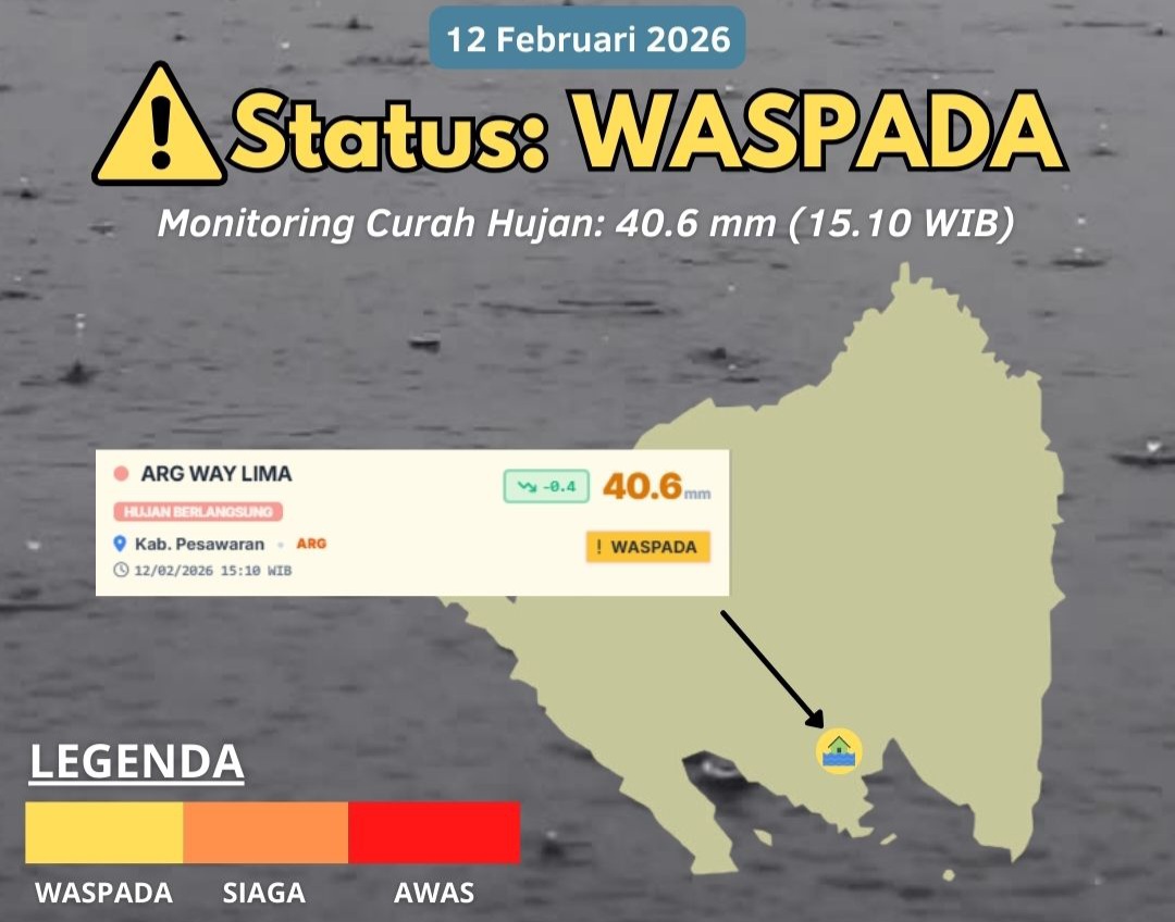 “Peringatan dini dampak hujan sedang – lebat Kabupaten Pesawaran, Kamis, 12 Februari 2026 dengan status waspada. Monitoring curah hujan 40.6 mm (15.10 WIB),” tulis BMKG dalam siarannya.