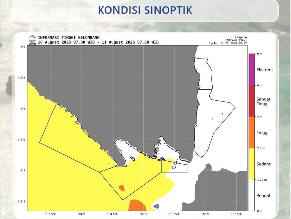 “BMKG memperkirakan tinggi gelombang 1,25–2,5 meter berpeluang terjadi pada Perairan Teluk Lampung bagian selatan,” himbau BMKG dalam siarannya, Sabtu, 9 Agustus 2025.