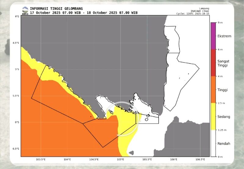 Bandar Lampung (Lampost.co) – Badan Meteorologi Klimatologi dan Geofisika (BMKG) menyampaikan peringatan waspada gelombang tinggi perairan Lampung. Peringatan dini tersebut mulai berlaku 17 Oktober 2025 pukul 07.00 WIB – 20 Oktober 2025 pukul 07.00 WIB