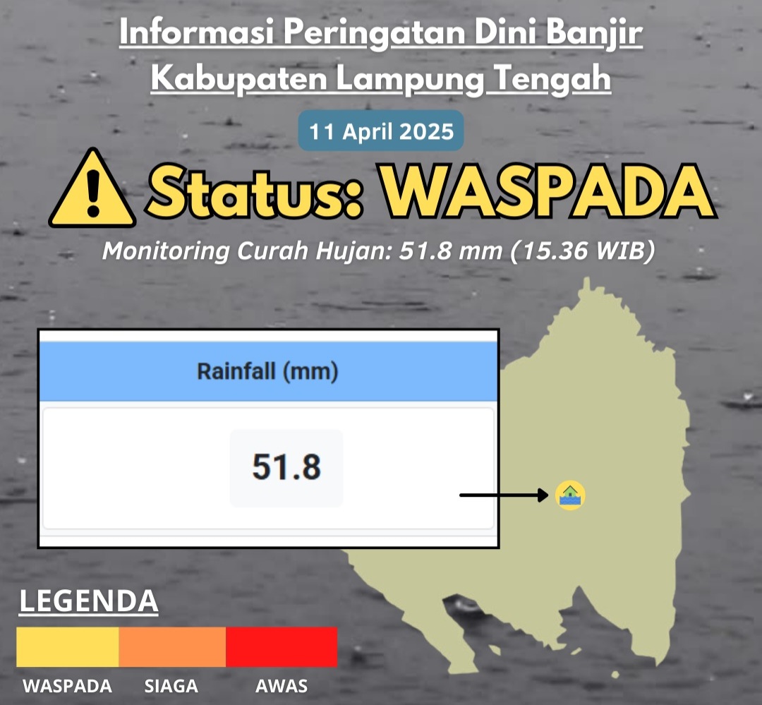 “Peringatan dini banjir Lampung Tengah, Jumat, 11 April 2025 dengan status waspada. Sementara curah hujan terpantau 51.8 mm (pukul 15.36 WIB),” kata Prakirawan BMKG Lampung dalam siaran resminya.