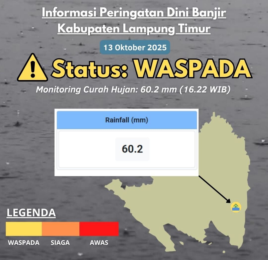 “Peringatan dini banjir Kabupaten Lampung Timur, Senin, 13 Oktober 2025 dengan status waspada. Sementara monitoring curah hujan 60.2 mm (16.22 WIB),” kata Prakirawan BMKG Lampung dalam siarannya.