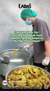 Gerai selalu sibuk sejak siang hingga senja. Ting! Perangkat Android di meja kasir Ayam Sambal Ladas menerima pesanan baru. “Ratna!” teriak kasir dari balik mejanya. Sedikit tergopoh, seorang driver ojek daring berjaket hijau menghampiri. “Kode 6894,” ucap driver kepada kasir, mengonfirmasi kode pesanan.