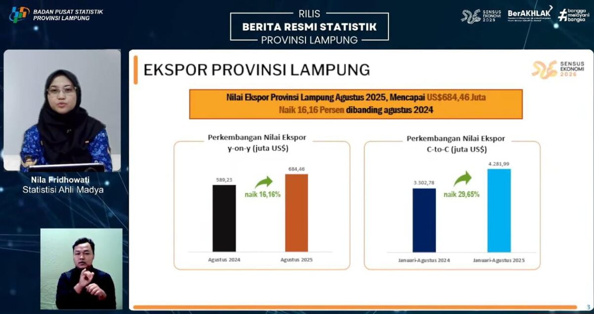 Ia menjelaskan, nilai ekspor Lampung mencapai US$684,46 juta khusus pada Agustus 2025. Angka itu tumbuh 16,16 persen daripada Agustus 2024 senilai US$589,23 juta.