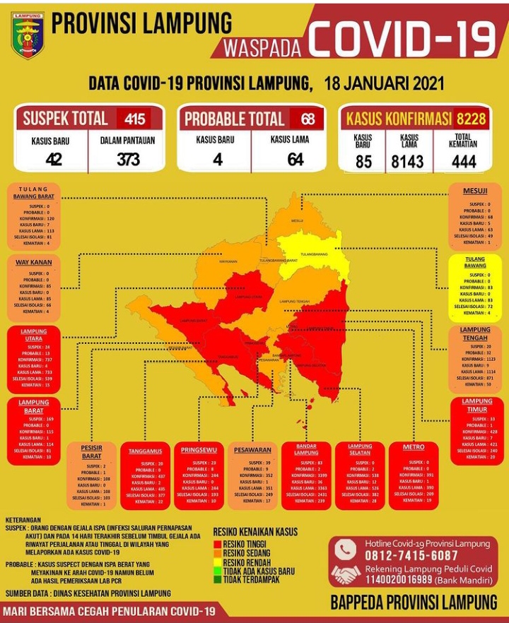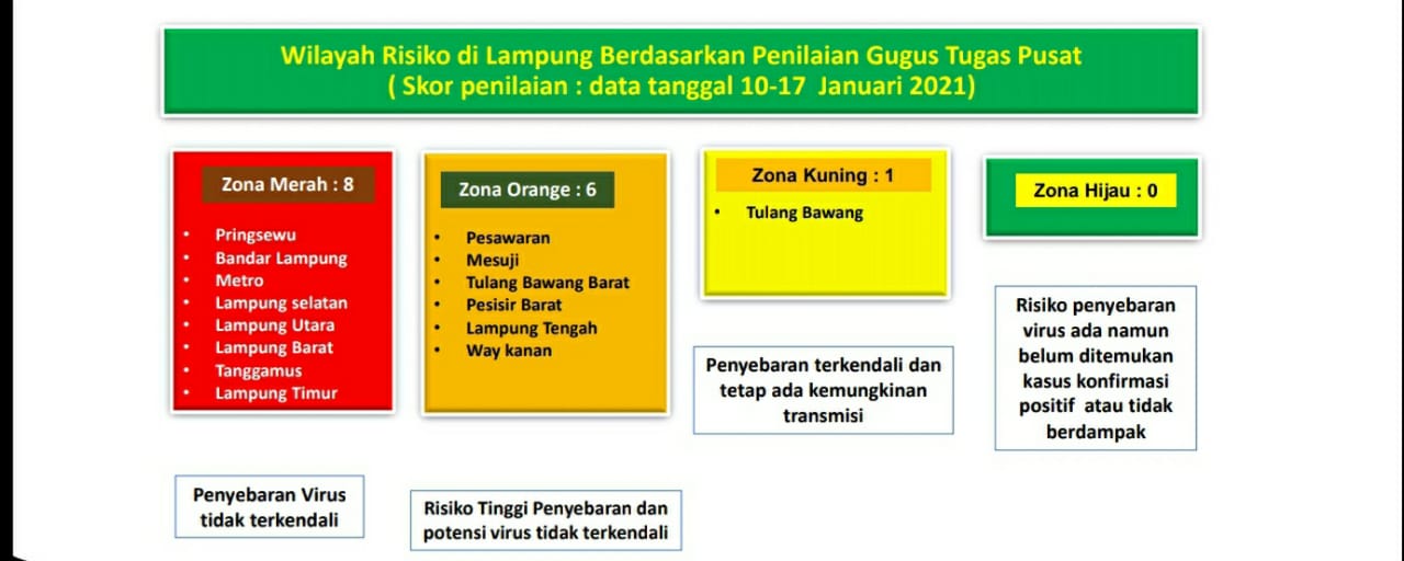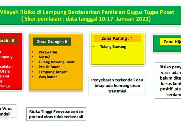Adapun status zona di tiga daerah di Lampung yang naik menjadi merah yakni Pringsewu, Lampung Utara, dan Lampung Barat. Sebelumnya, tiga daerah tersebut berstatus zona oranye pada pekan lalu. Data tersebut berdasarkan update Tim Satgas Penanganan Covid-19 Lampung, Senin, 18 Januari 2021.