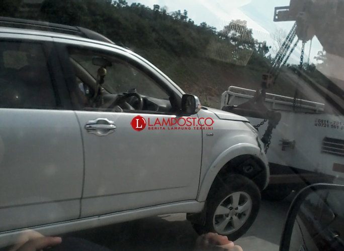 Kendaraan yang mengalami kecelakaan tunggal di tol Sidomulyo km 41 tengah di derek petugas, Rabu (5/6/2019). (Foto:Lampost/sri aguatina)