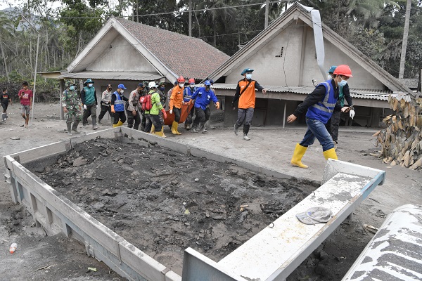 EVAKUASI KORBAN. Tim SAR gabungan mengevakuasi jenazah korban yang tertimbun material guguran awan panas Gunung Semeru saat operasi pencarian korban di Desa Sumberwuluh, Lumajang, Jawa Timur, Senin (6/12). Berdasarkan laporan Badan Nasional Penanggulangan Bencana (BNPB), jumlah korban meninggal hingga pukul 11.10 WIB, kemarin, berjumlah 15 orang dan 27 orang masih dalam proses pencarian. ANTARA FOTO/ZABUR KARURU