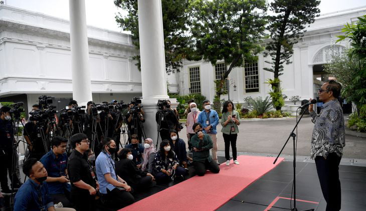 PRO-KONTRA PERPPU CIPTAKER. Menteri Koordinator bidang Politik, Hukum, dan Keamanan Mahfud MD (kanan) menyampaikan keterangan pers seusai mengikuti rapat terbatas dengan Presiden Joko Widodo di Istana Kepresidenan Jakarta, Selasa (3/1). Mahfud MD menyebut masyarakat dipersilakan mengkritik isi Peraturan Pemerintah Pengganti Undang-undang Nomor 2 Tahun 2022 tentang Cipta Kerja. Dia menegaskan bahwa prosedur pembuatan produk hukum tersebut sudah sesuai prosedur. ANTARA/SIGID KURNIAWAN