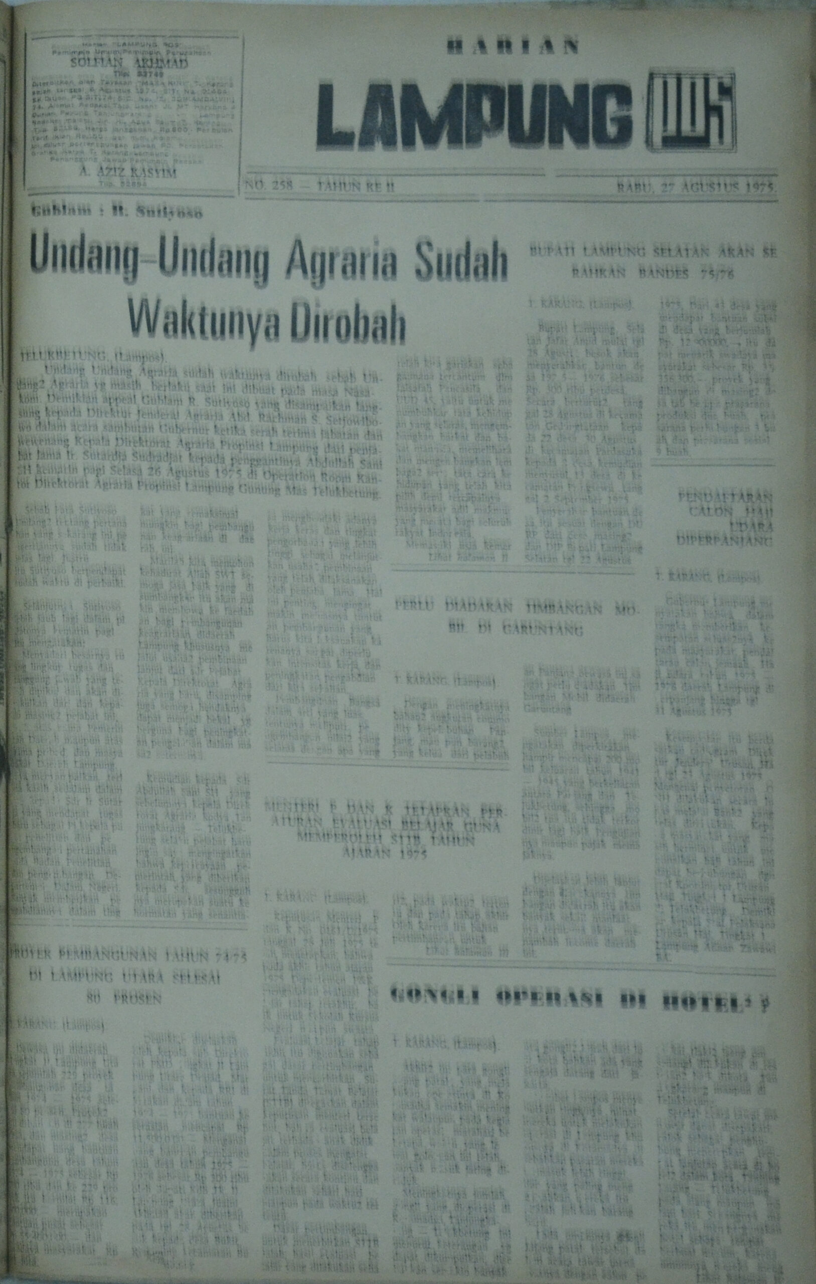 Lampung Post edisi Rabu, 27 Agustus 1975 mengambil topik mengenai Undang-Undang Agraria yang sudah waktunya diubah.