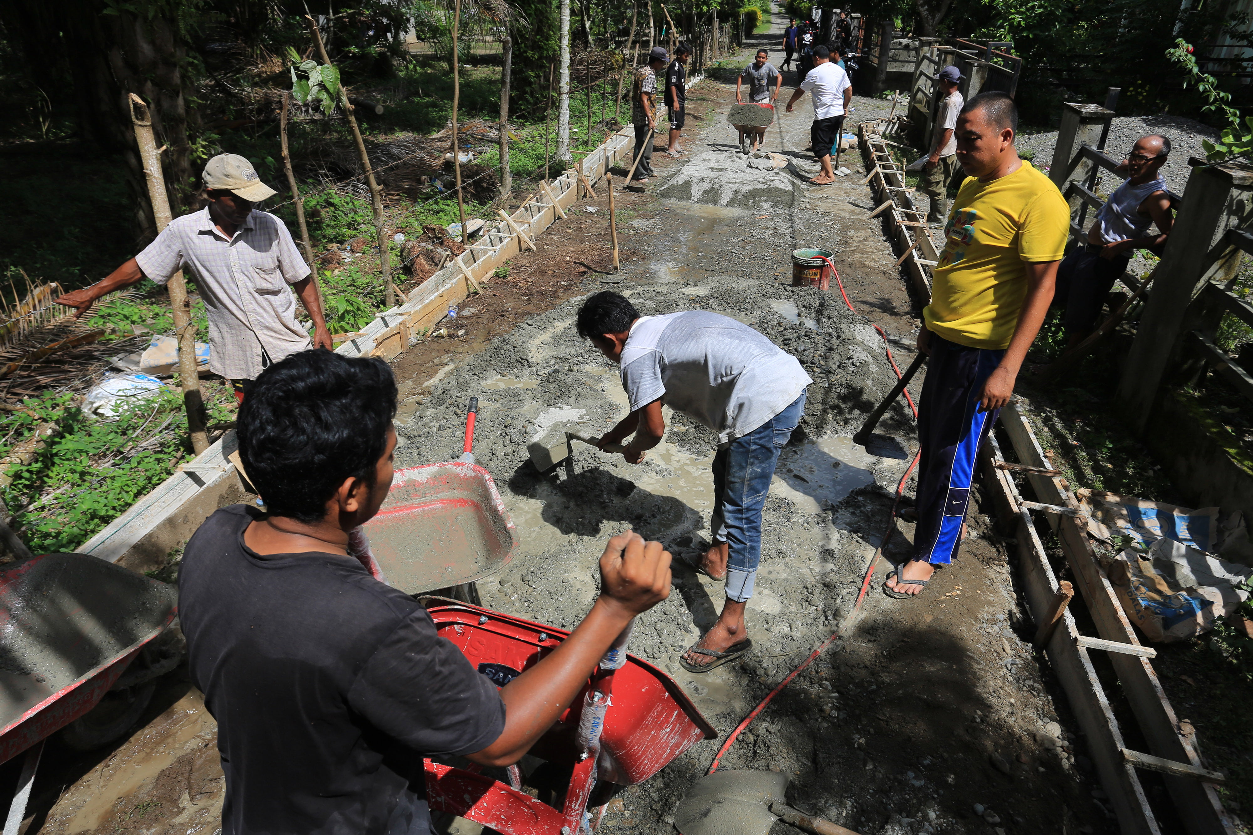 Sejumlah warga menyelesaikan pembuatan tembok pelindung batas badan jalan dari anggaran dana desa di Desa Alue Raya, Kecamatan Samatiga, Aceh Barat, Aceh, Minggu (7/8/2022). Pemerintah sejak 2015-2022 telah menyalurkan dana desa sebesar Rp468 triliun yang dimanfaatkan untuk berbagai pembangunan desa. ANTARA FOTO/Syifa Yulinnas/foc.