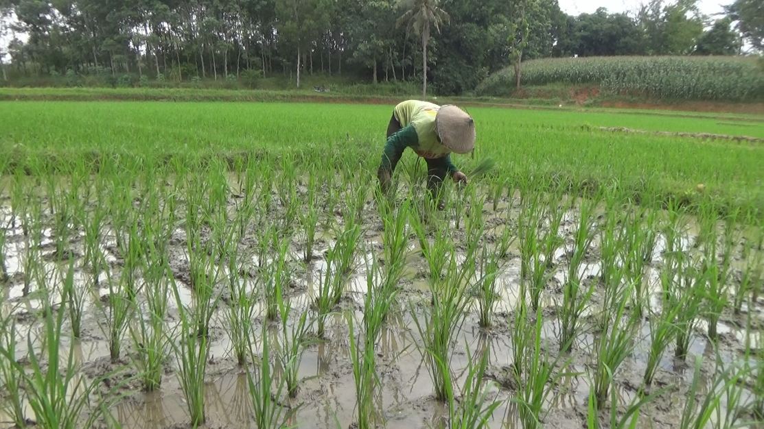DISTRIBUSI BERAS. Petani Kampung Bumimas, Lampung Tengah, membersihkan rumput di persawahan, beberapa hari lalu. Perum Bulog Divisi Regional Lampung akan memperluas jangkauan distribusi beras ke ritel modern dalam rangka stabilisasi pasokan dan harga pangan.