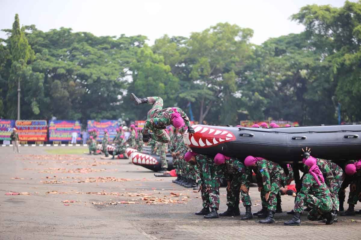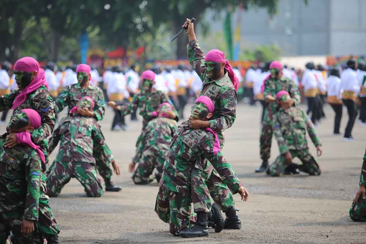 HUT TNI. Brigif 3 Marinir melakukan atraksi bela diri dalam peringatan HUT TNI ke 73 di Lapangan Saburai, Bandar Lampung, Jumat (5/10).