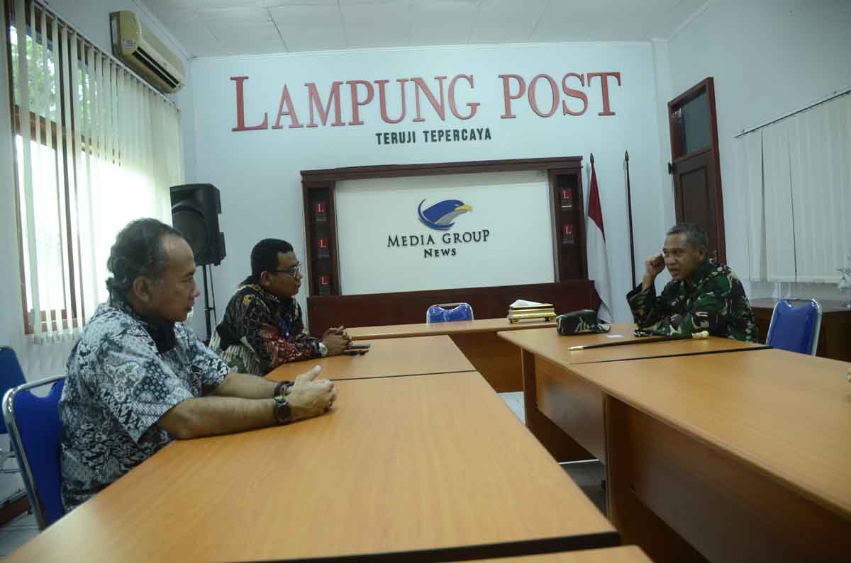 KUNJUNGAN DANREM. Komandan Korem 043/Garuda Hitam Kolonel Infanteri Toto Jumariono (kanan) berbincang dengan Pemimpin Redaksi Lampung Post Iskandar Zulkarnain dan Pemimpin Perusahaan Lampung Post Riza Mauludin saat kunjungan ke Kantor Lampung Post, Rabu (13/5).