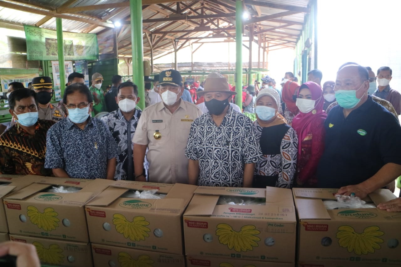 Menteri Koperasi dan Usaha Kecil Menengah (UKM) Teten Masduki, Menteri Agraria Tata Ruang/Badan Pertanahan Nasional (ATR/BPN) Sofyan A Djalil, Gubernur Lampung Arinal Djunaidi, dan Bupati Tanggamus Dewi Handajani melihat sentra pisang mas yang komoditasnya telah berhasil pada pasar ekspor, serta hasil kerajinan usaha mikro, kecil, dan menengah (UMKM) yang ada di Kecamatan Sumberejo Tanggamus, Minggu (28/2). n ISTIMEWA
