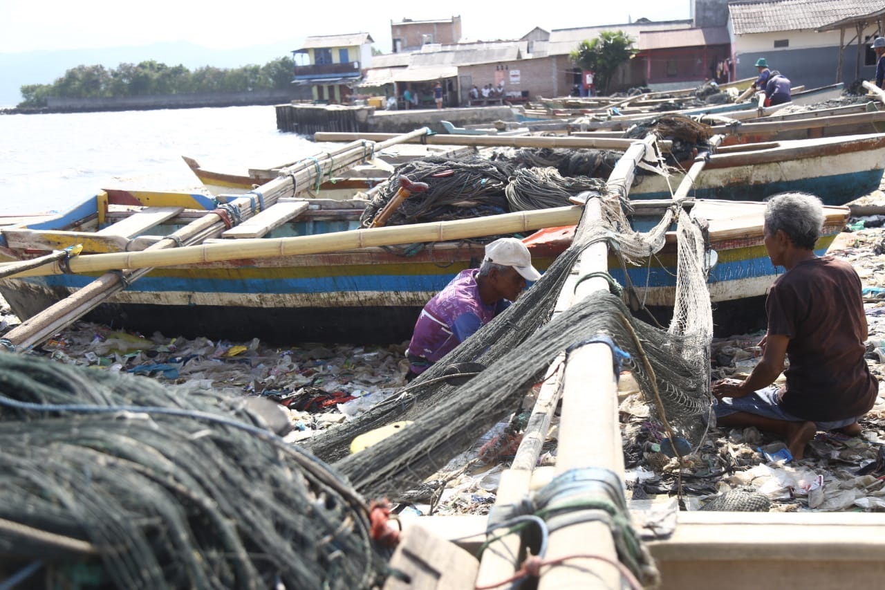TIDAK MELAUT. Nelayan memperbaiki jaringnya di Teluk Lampung, Bandar Lampung, Minggu (18/10). Nelayan memilih tidak melaut dan memperbaiki alat tangkapnya dikarenakan angin kencang dan ombak besar seiring dengan mulai munculnya fenomena La Nina di Indonesia yang akan mencapai puncaknya pada Desember 2020—Januari 2021 sesuai prakiraan dari BMKG.