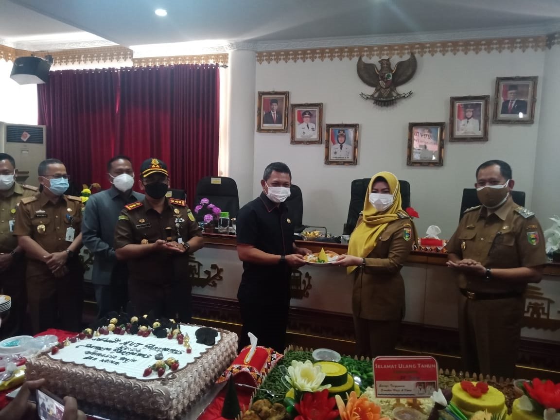 Bupati Tanggamus Dewi Handajani, didampingi Wakil Bupati AM Syafi'i, memberikan potongan tumpeng kepada Ketua DPRD Heri Agus Setiawan yang disaksikan Forkompinda setempat saat peringatan hari ulang tahun ke-24 Kabupaten Tanggamus, di ruang rapat utama Pemkab setempat, Senin (22/3). DOK PEMKAB TANGGAMUS