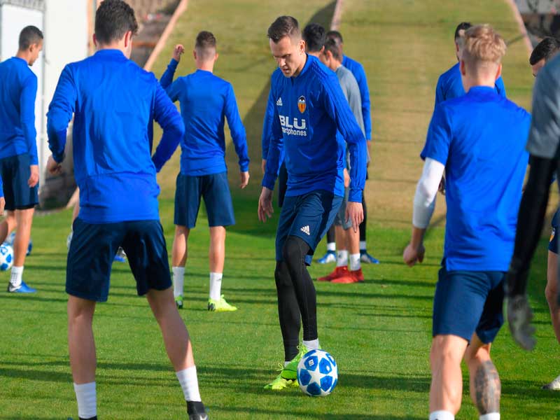 Para pemain Valncia saat sedang melakukan latihan. (AFP/JOSE JORDAN)