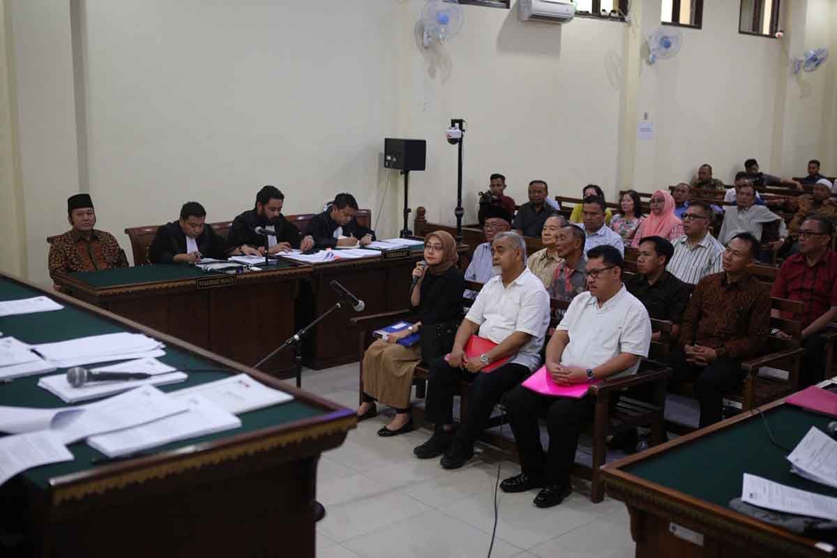 SIDANG LANJUTAN ZAINUDIN HASAN. Terdakwa kasus dugaan korupsi fee proyek PUPR Lampung Selatan yang juga Bupati Lampung Selatan nonaktif Zainudin Hasan (kiri) mendengarkan keterangan saksi saat menjalani sidang di Pengadilan Tipikor Bandar Lampung, Lampung, Senin (11/2). LAMPUNG POST/IKHSAN DWI NUR SATRIO