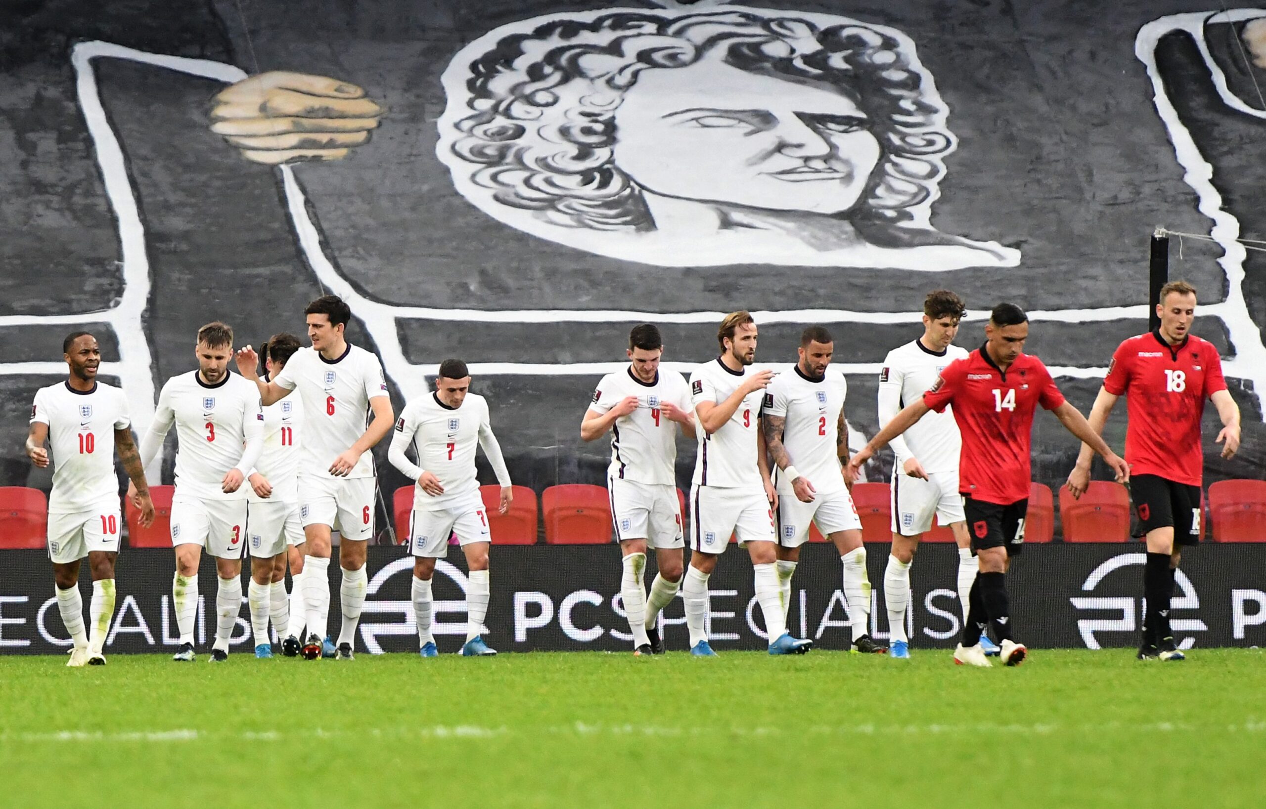 RAYAKAN KEMENANGAN. Para pemain Inggris merayakannya kemenangan atas Albania pada kualifikasi Piala DUnia 2022 Qatar Grup I di Stadion Air Albania, Tirana, Minggu (28/3) waktu setempat. Inggris berupaya memetik kemenangan ketiga saat menjamu Polandia, Kamis (31/3). GENT SHKULLAKU/AFP