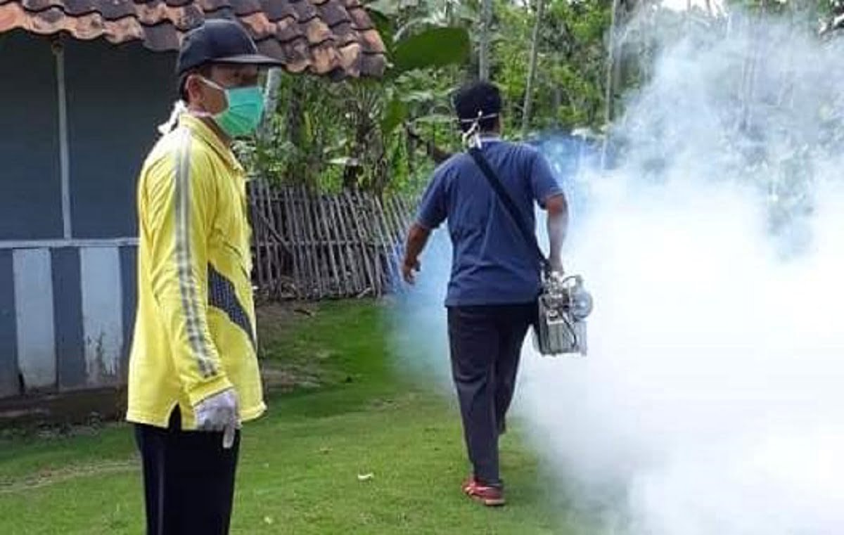 PENGASAPAN. Petugas Puskesmas Rawat Jalan Kecamatan Palas, Lampung Selatan, melakukan pengasapan di radius 100 meter dari rumah pasien DBD di Desa Sukabakti, Jumat (8/3). Kasus DBD di Kecamatan Palas terus bertambah. (LAMPUNG POST/ARMANSYAH)