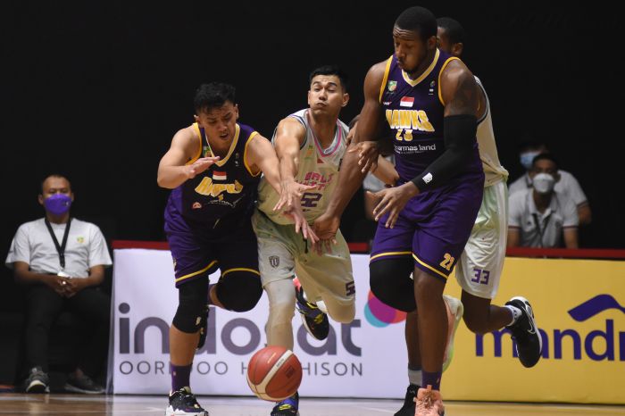 Laga IBL 2022 menampilkan pertandingan antara klub Bali United dan Tangerang Hawks di di Hall Basket Kompleks GBK, Jakarta, Selasa (18/1).ANTARA FOTO/Indrianto Eko Suwarso
