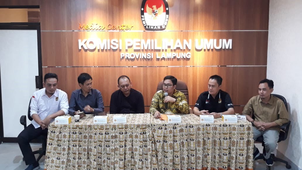 Ketua KPU Provinsi Lampung, Erwan Bustami, bersama Agus Rianto, M Tio Aliansyah, Ali Sidik, Antonius Cahyalana, dan Ismanto, memberikan pernyataan sikap mengenai Esti Nur Fathonah yang dicopot dari jabatan anggota KPU Provinsi Lampung, di kantor KPU setempat, Kamis (13/2).