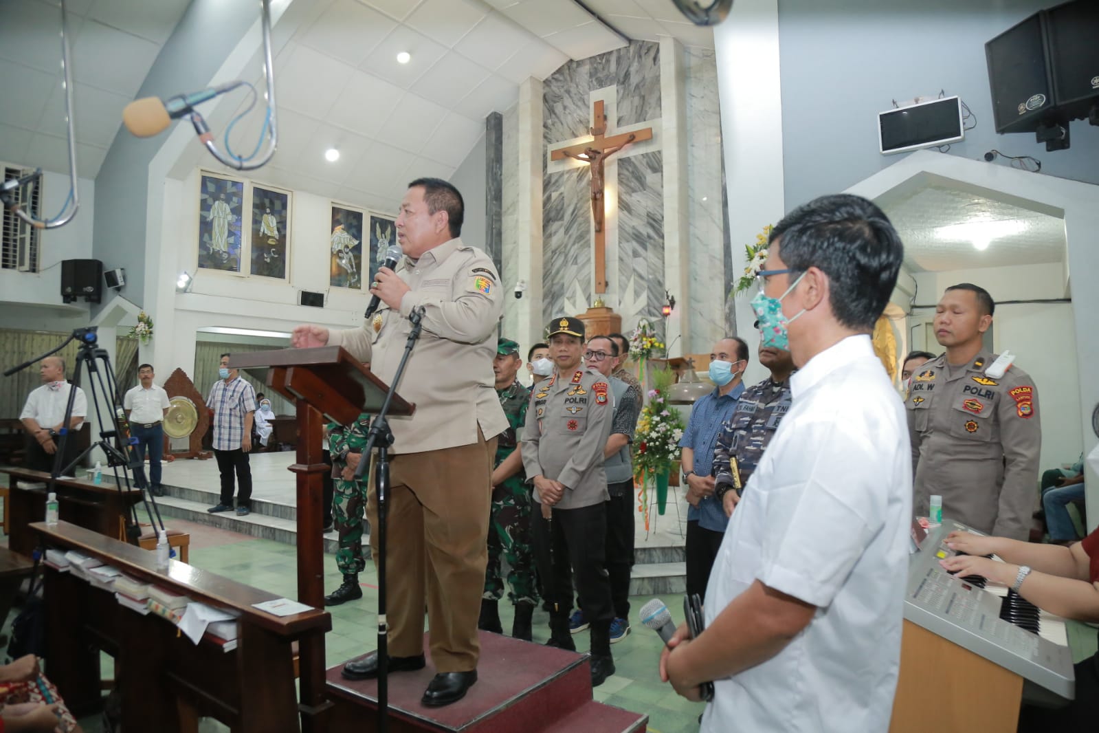 MISA NATAL. Gubernur Lampung, Arinal Djunaidi, bersama Kapolda Lampung, Irjen Akhmad Wiyagus, dan Forkopimda saat meninjau pelaksanaan misa Natal di Gereja Katedral Tanjungkarang, Bandar Lampung, Sabtu (24/12) malam. n LAMPUNG POST/ZAINUDDIN
