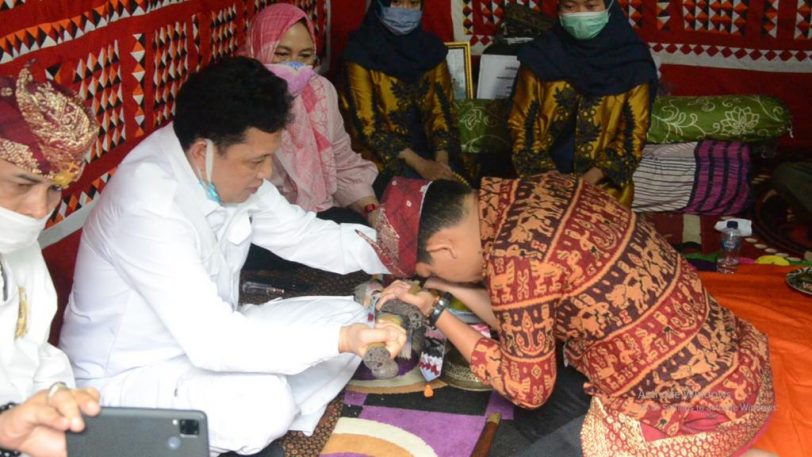 SERAHKAN PUSAKA. Sultan Sekala Bekhak Edward Syah Pernong menyerahkan Pusaka ke Pangeran Marga Dantaran. LAMPUNG POST/FEBI HERUMANIKA