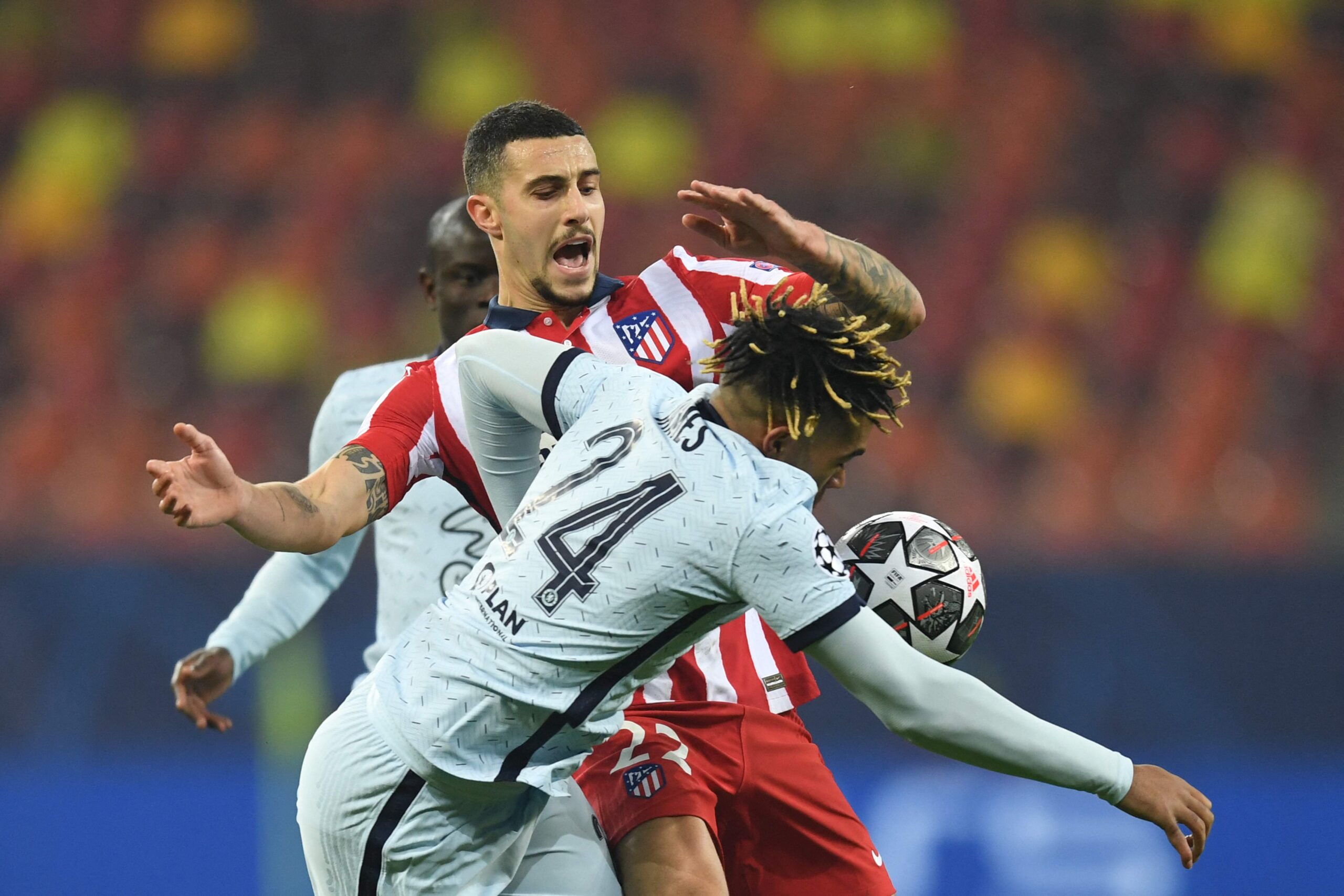 ATLETICO VS CHELSEA. Bek Chelsea Reece James (kanan) menantang bek Atletico Madrid Mario Hermoso saat pertama babak 16 besar Liga Champions antara Atletico Madrid dan Chelsea, di Stadion Arena Nationala, Bukares, Rabu (24/2). AFP/DANIEL MIHAILESCU