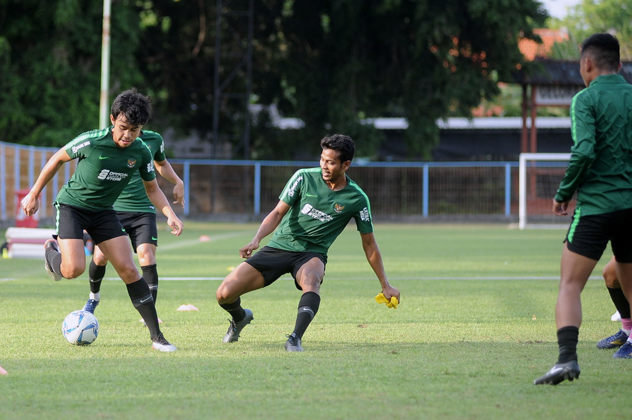 BERLATIH. Para pemain Timnas Indonesia U-23 berlatih di Lapangan Gelora Samudra, Kuta, Bali, Selasa (12/11). Latihan tersebut dilakukan menjelang pertandingan uji coba melawan Timnas Iran U-23 di Stadion Kapten I Wayan Dipta Gianyar Rabu (13/11). (ANTARA/FIKRI YUSUF)