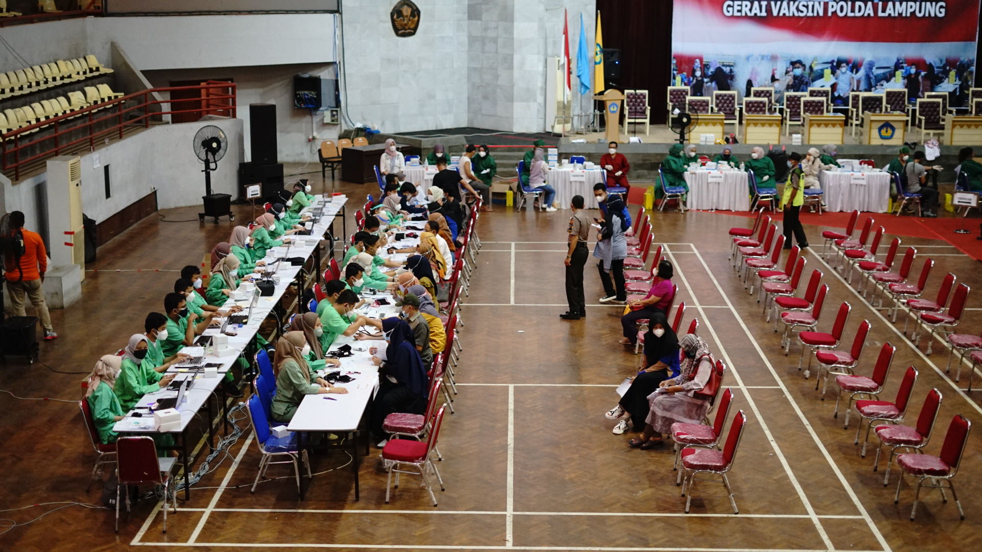 VAKSINASI BATCH 7 DI UNILA. Peserta mengikuti vaksinasi batch 7 dosis pertama di Gedung Serbaguna Unila, Minggu (19/9). Vaksinasi ini ditujukan bagi mahasiswa, dosen, tenaga kependidikan Unila, serta masyarakat umum.