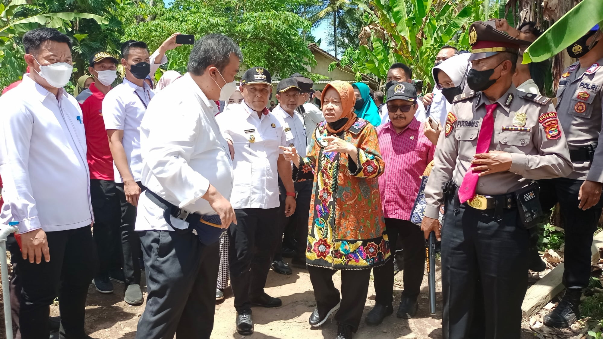 SAMBANGI KORBAN BANJIR. Menteri Sosial, Tri Rismaharini, bersama Bupati Lampung Selatan, Nanang Ermanto, saat menyambangi korban banjir di Dusun Tasik, Desa Banyumas, Kecamatan Candipuro, Lampung Selatan, Rabu (2/11). Menteri Sosial juga memberikan bantuan sandang, panganan, perabotan rumah tangga, permainan anak-anak, dan lainnya kepada korban banjir di Dusun Tasik. LAMPUNG POST/PERDHANA WIBYSONO