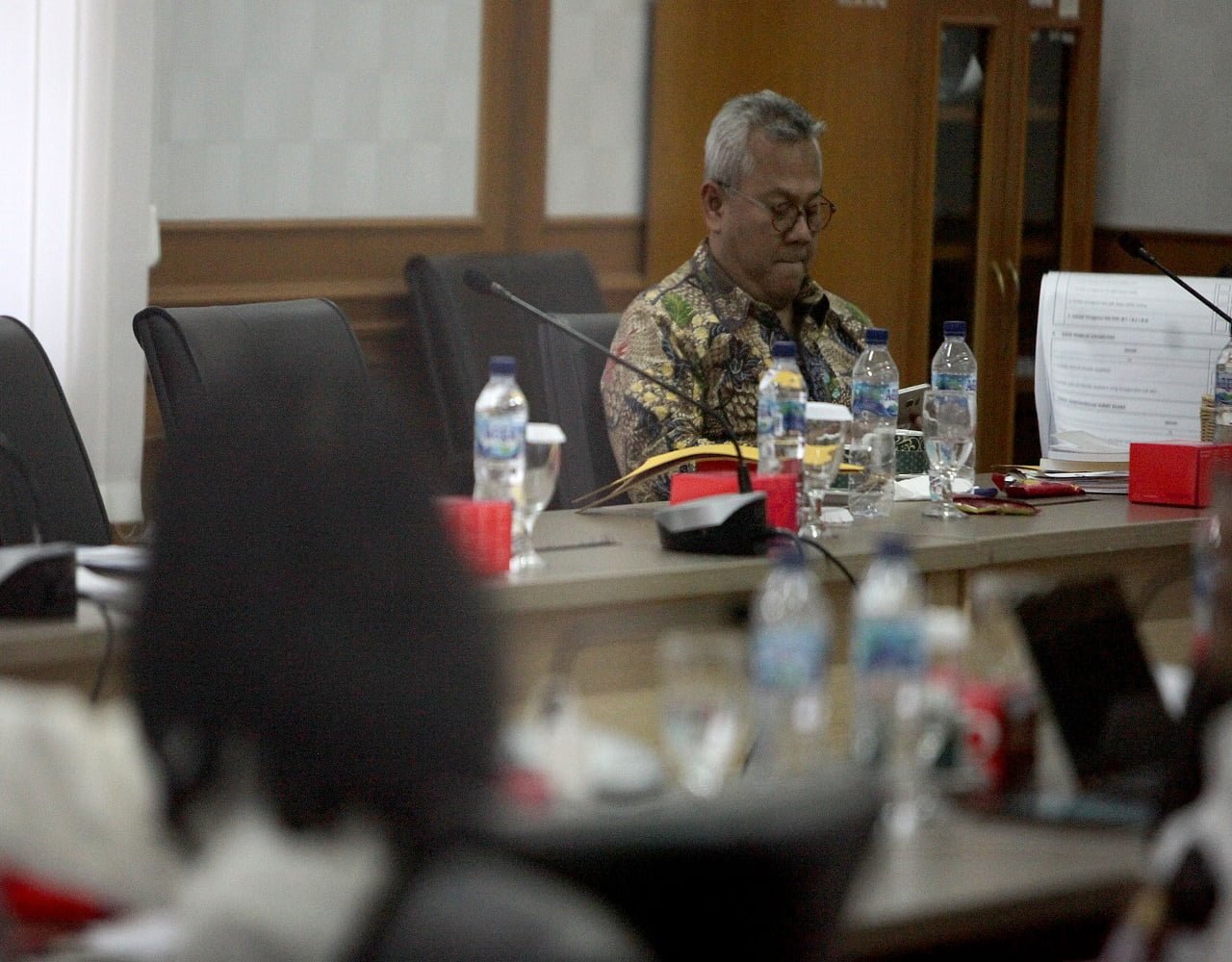 RAPAT PLENO KPU. Ketua Komisi Pemilihan Umum (KPU) Arief Budiman memeriksa alat komunikasinya saat memimpin rapat pleno yang digelar tertutup di Gedung KPU, Jakarta, Senin (16/3). Rapat rutin tersebut membahas sejumlah agenda, antara lain menyikapi perkembangan Pilkada 2020 berkaitan dengan pandemi virus Corona atau Covid-19. (MI/SUSANTO)