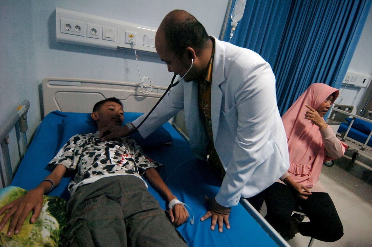 PASIEN DBD. Dokter memeriksa pasien anak penderita DBD saat menjalani perawatan di Rumah Sakit Mitra Siaga, Kabupaten Tegal, Jawa Tengah, Jumat (14/2). Hingga pekan keenam 2020, Lampung dan Jabar menjadi provinsi dengan jumlah DBD terbanyak di Indonesia. (ANTARA/OKY LUKMANSYAH)