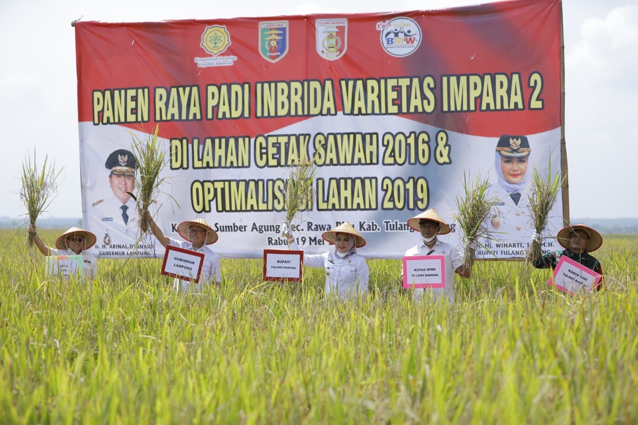 PANEN RAYA. (Dari kiri) Ketua Tim Kartu Petani Berjaya (KPB) Yusuf S Barusman, Sekretaris Provinsi Lampung Fahrizal Darminto, Bupati Tulangbawang Winarti, Ketua DPRD Tulangbawang Sofi'i, dan Dandim 0426 Tulangbawang Letkol Kav Joko Sunarto saat panen raya padi di Kampung Sumberagung, Kecamatan Rawapitu, Tulangbawang, Rabu (19/5). LAMPUNG POST/FERDI IRWANDA