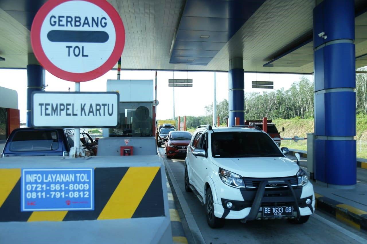 TARIF TOL. Kendaraan memasuki gerbang tol Kota Baru beberapa waktu yang lalu. PT Hutama Karya (HK) masih belum mengetahui kapan tarif tol Bakauheni—Terbanggibesar—Pematangpanggang (Baterpang) ditetapkan Kementerian Pekerjaan Umum dan Perumahan Rakyat (Kementerian PU-PR). (LAMPUNG POST/SUKISNO)