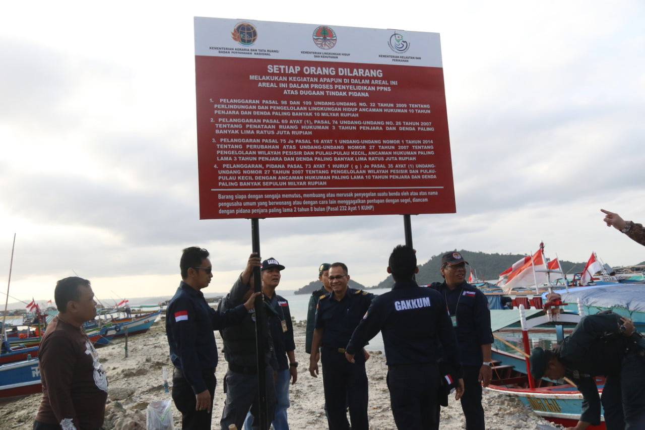 PENYEGELAN REKLAMASI. Satgas memasang plang penyegelan di wilayah Pantai Marita Sari Ringgung yang di lokasi tersebut dilakukan reklamasi, Selasa (6/8). Penyegelan tersebut agar pengusaha taat aturan.
