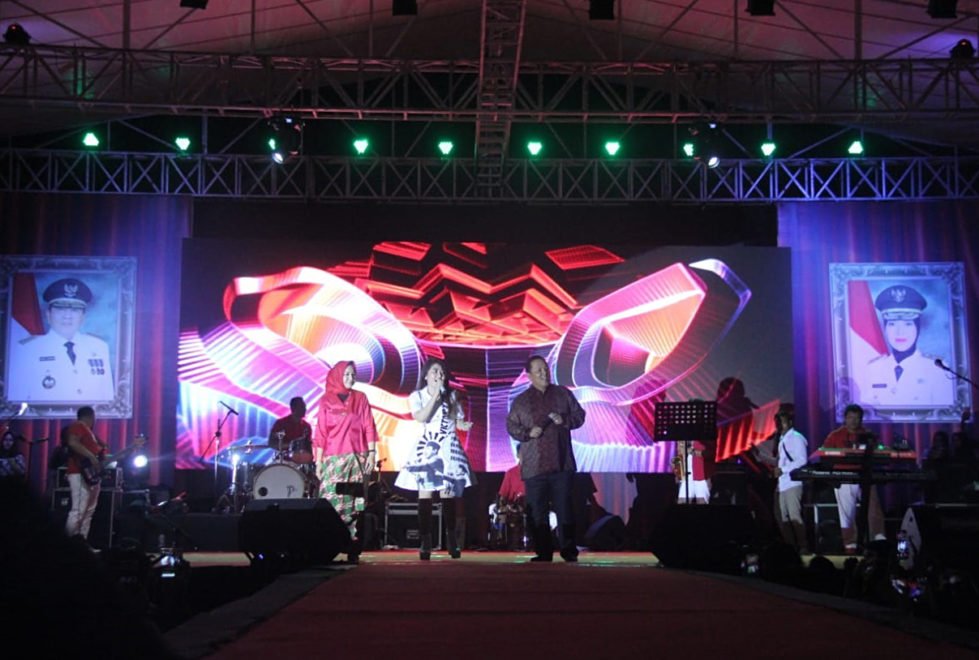 PESTA RAKYAT. Gubernur Lampung Arinal Djunaidi (kanan) bersama istri Riana Sari Arinal (kiri) dan penyanyi Via Vallen saat menghadiri malam syukuran sekaligus pesta rakyat untuk memperingati hari ulang tahun (HUT) ke-74 RI di Lapangan Saburai, Senin (19/8). LAMPUNG POST/SUKISNO