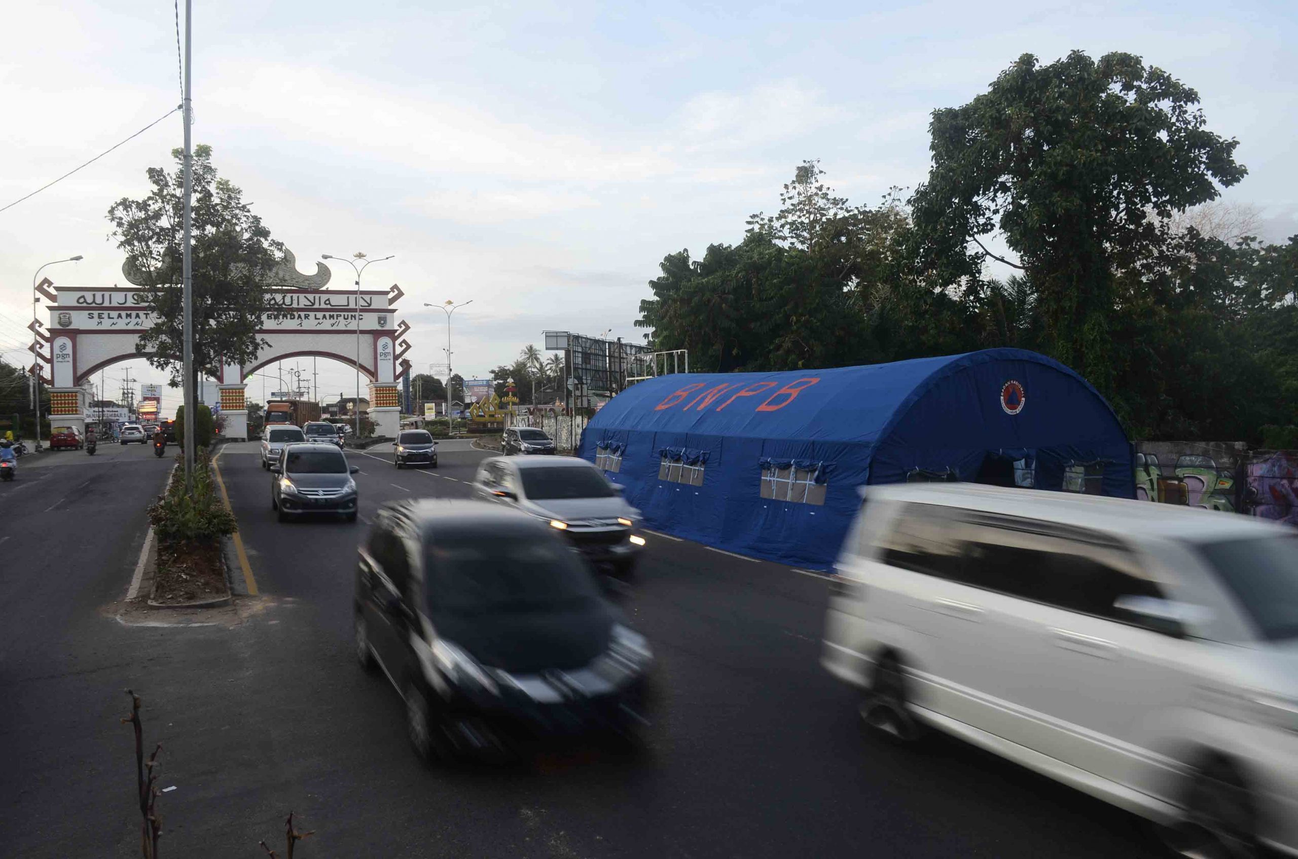 RAPID TEST MASSAL. Sejumlah kendaraan melintas di depan tenda BNPB yang dipersiapkan di gerbang masuk Kota Bandar Lampung Jalan ZA Pagaralam, Rajabasa, Bandar Lampung, Jumat (23/10). Pemerintah Kota Bandar Lampung akan melakukan rapid test massal kepada setiap warga yang memasuki Kota Bandar Lampung, Senin (26/10). LAMPUNG POST/HENDRIVAN GUMALA